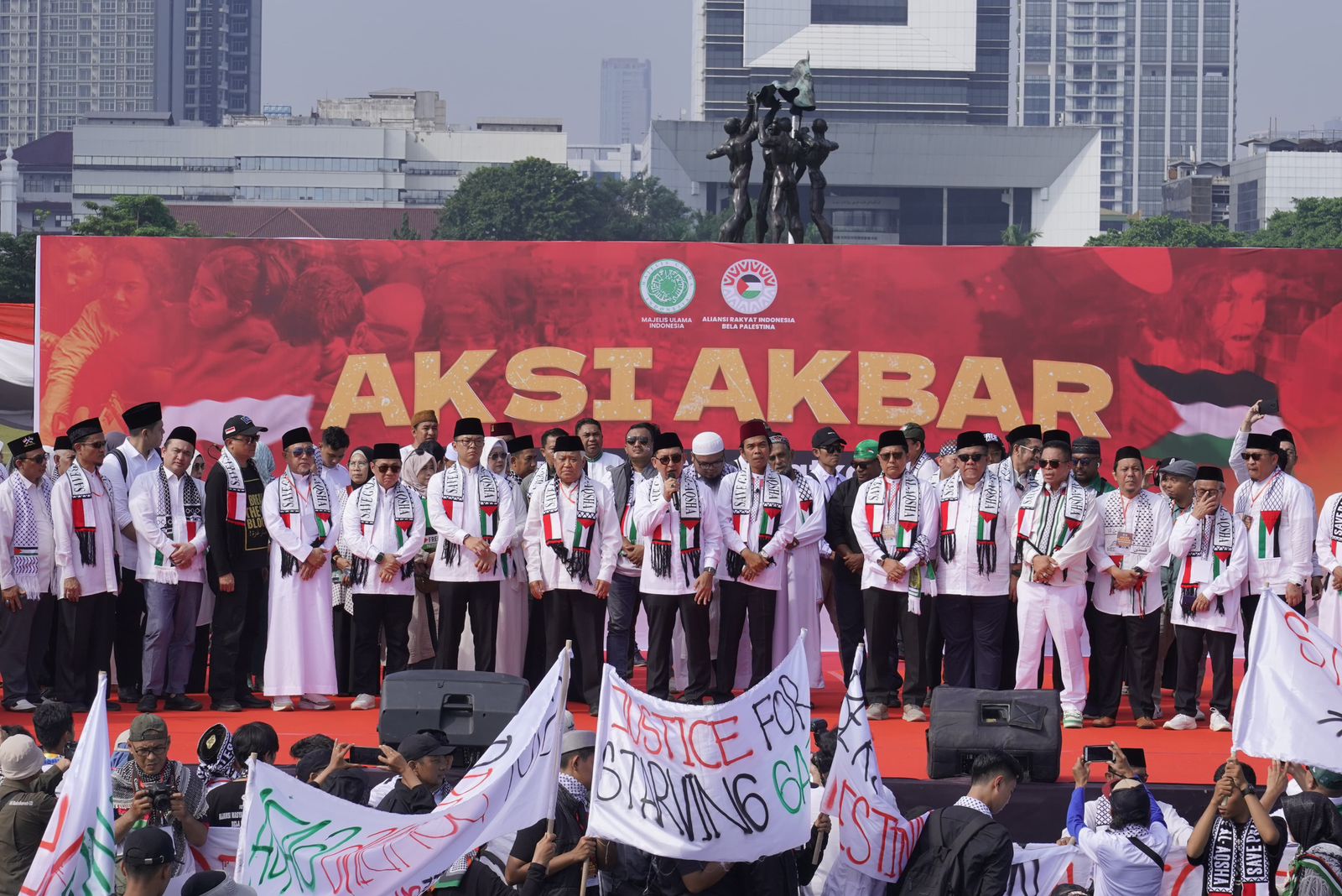 Digagas oleh Majelis Ulama Indonesia (MUI) dan Aliansi Rakyat Indonesia Bela Palestina (ARIBP), aksi ini dihadiri para tokoh ormas Islam, aktivis kemanusiaan, dan masyarakat dari berbagai penjuru negeri. Dalam aksi tersebut Menteri Kebudayaan, Fadli Zon, dalam orasinya menyampaikan bahwa kita adalah bangsa yang mendukung penuh kemerdekaan Palestina.