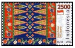 4️⃣ Seri prangko “Kain Tradisional Indonesia” terbitan tahun 2012 dengan nominal Rp 2.500 menggambarkan aneka ragam batik dari berbagai provinsi (termasuk batik Betawi DKI Jakarta).