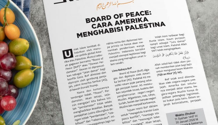 Umat Islam kembali dikejutkan oleh manuver politik global Amerika atas P4lest1n4. Muncul sebuah gagasan bernama “Board of Peace (BoP)” atau “Dewan Perdamaian”. Dewan ini dipromosikan sebagai “jalan damai” bagi konflik G4z4. BoP diinisiasi dan dipimpin oleh gembong penjajah, yakni Amerika Serikat (AS), di bawah Donald Trump.